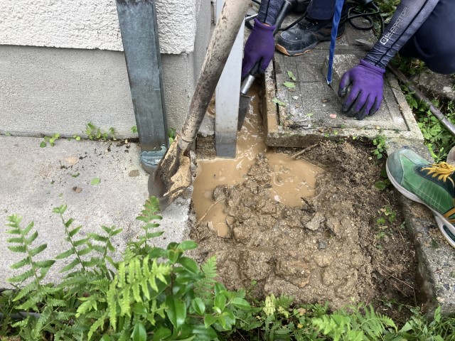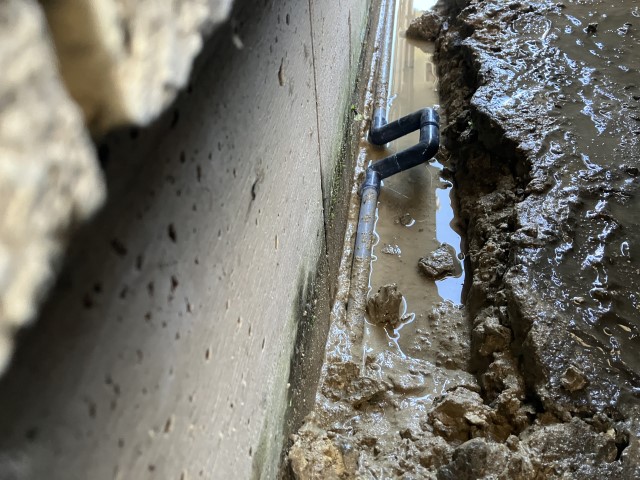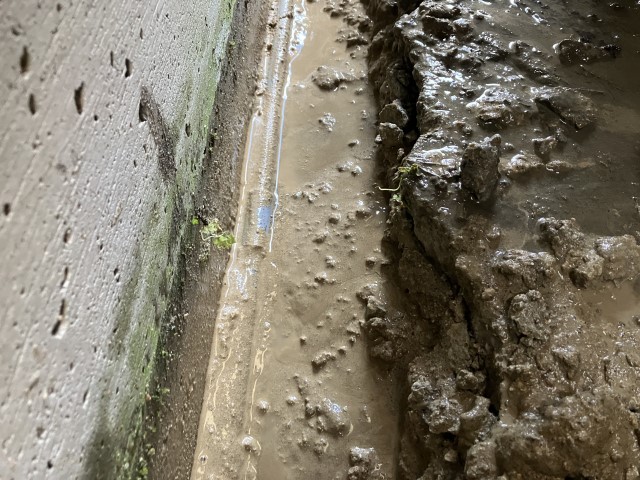 コンクリートを除去し、漏水個所を特定しました。漏水により周囲の土が流され、水が溜まっている状態です。