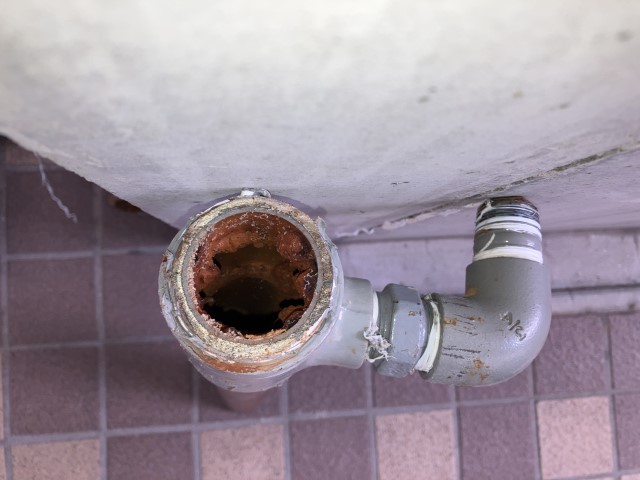 飲料水でも使われる給水管の内部です。経年によりネジ部や内部がサビで腐食しています。 (2)