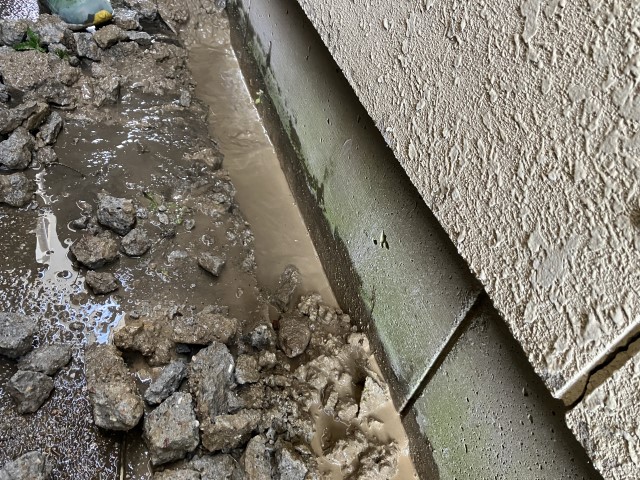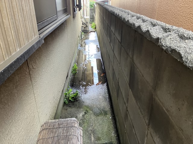 名東区の住宅です。漏水して建物外周に大きな水溜りができています。
