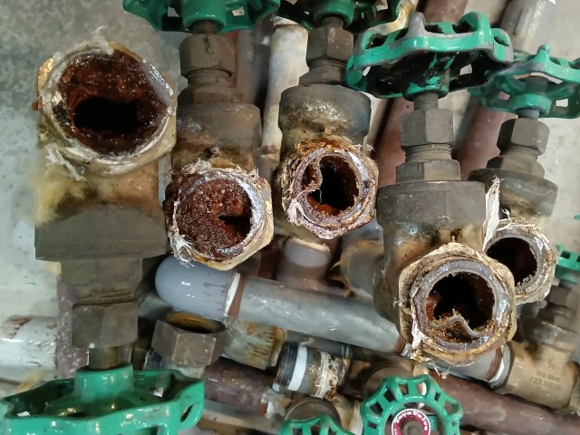 各部屋の撤去管とバルブです。管内には詰まってしまいそうなほど錆が付いているものもあります。