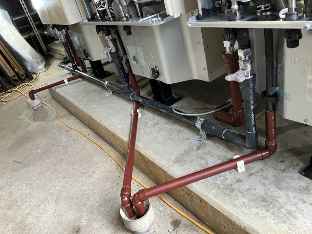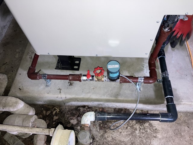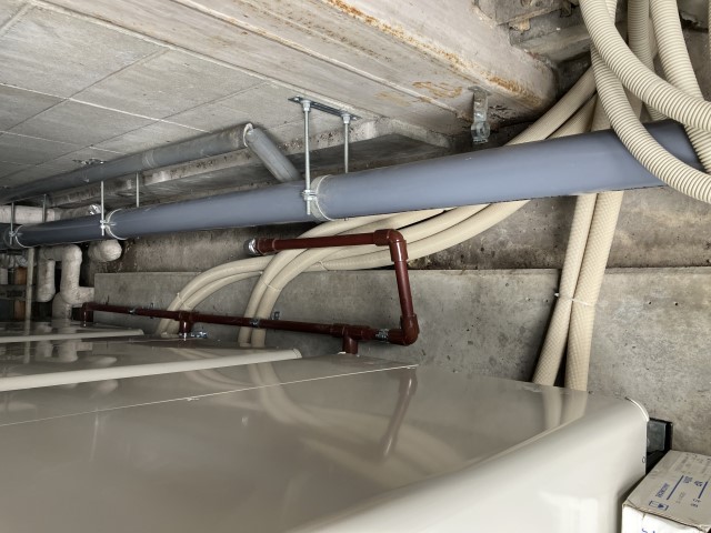 事務所に設置されたエコキュートの交換工事を行いました。配管後の貯湯ユニット周りです。