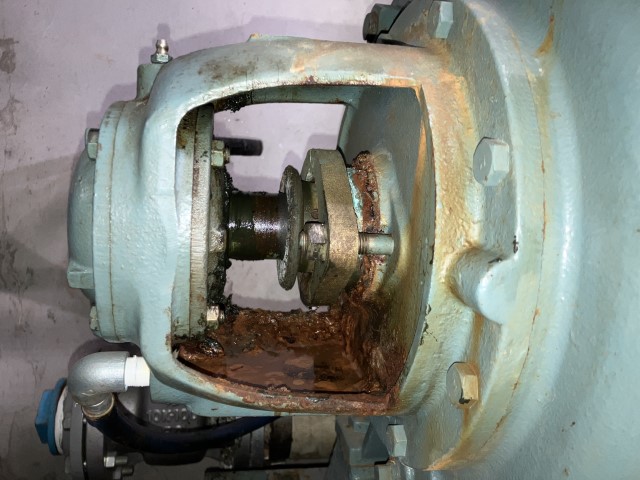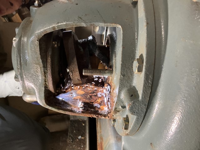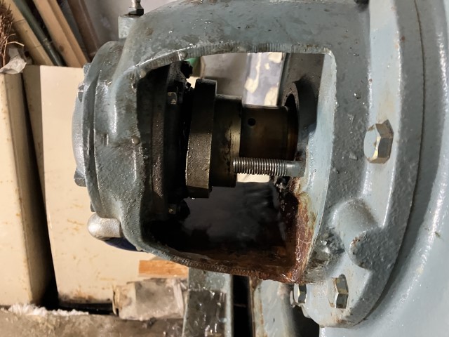 パッキン取り外し作業の様子です。長年の使用でひどく劣化していました。グランドパッキンを交換しこちらは完了です。