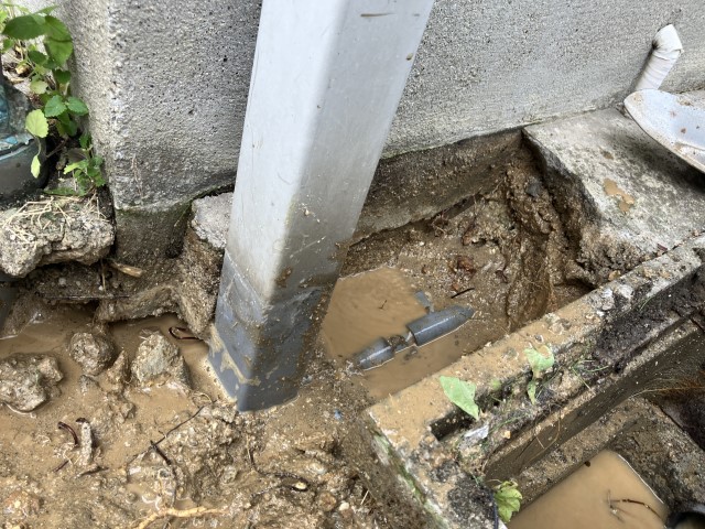 コンクリートを除去し、漏水個所を特定しました。漏水により周囲の土が流され、水が溜まっている状態です。