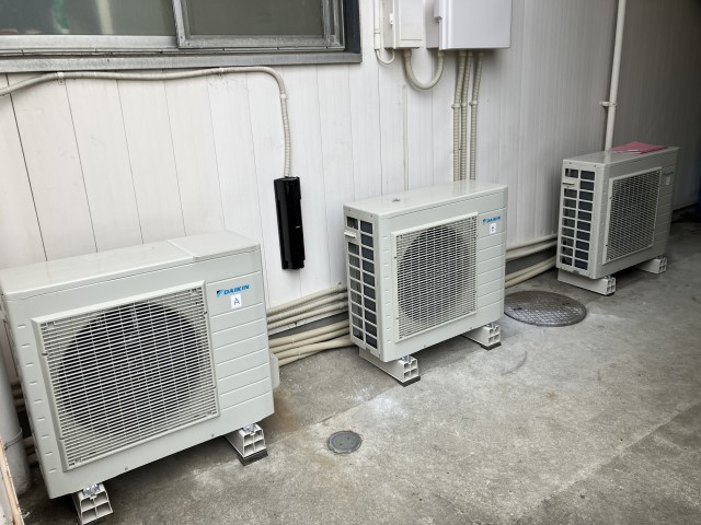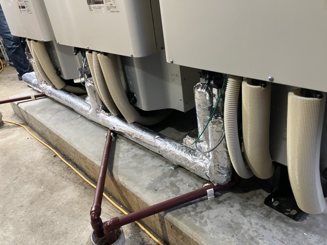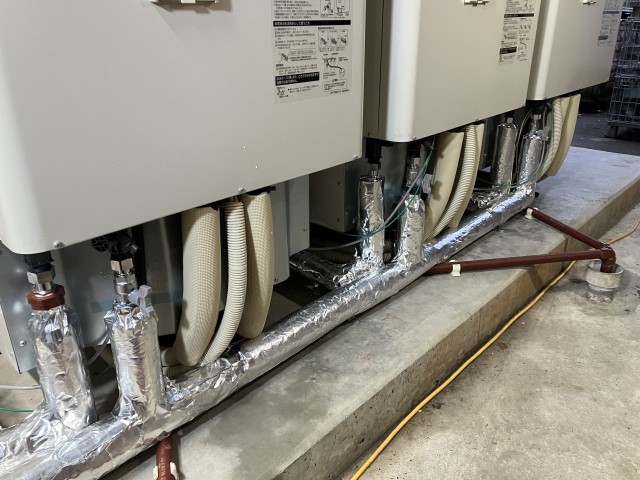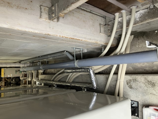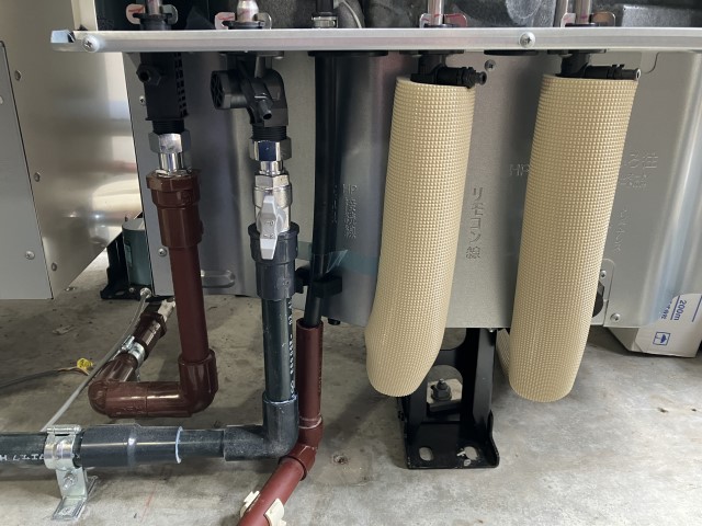 事務所に設置されたエコキュートの交換工事を行いました。配管後の貯湯ユニット周りです。